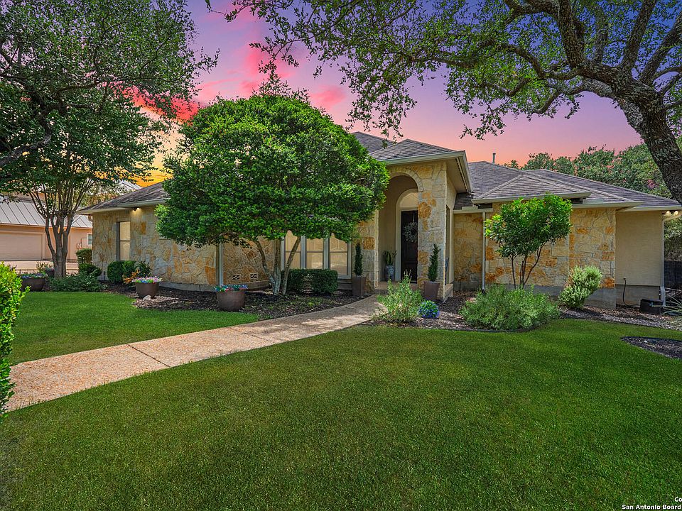 This pristine home on a near 1/3 acre greenbelt lot in highly coveted, guarded Emerald Forest combines a thoughtful plan, tasteful updates, and a resort-style backyard retreat. Arrive, and fall in love with the curb appeal afforded by the stone and stucco elevation, mature oak trees, and the manicured lawn. Step inside to a grand foyer with captivating views to the rear courtyard, grounds and green space beyond the property. Designer ceilings appeal to the eye, while natural light floods the residence from expansive windows. The chef's island kitchen, with well-appointed butler's pantry, boasts 36 inch 5 burner gas cooking with classic arched brick surround, granite counters, quartz backsplash, custom white open-face cabinetry, modern fixtures, reverse osmosis drinking water, a composite sink, and an expansive walk-in pantry. It also hosts a breakfast bar, built-in desk space or coffee bar, and an ample morning area. Doubling as a service buffet, the butler's pantry offers granite counters, more open-face white cabinets and hardwoods floors that flow into the formal dining room. It's roomy, anchored by a modern light fixture, designer ceiling treatment and natural light. The inviting living room features built-in cabinetry, plantation shutters, and backyard pool views, hardwoods, a large ceiling fan and warm finishes. A second living space is afforded by the sunroom wrapped in windows with shades, providing tranquil views of the backyard, green space, and wildlife. There is a well appointed guest bath to enhance entertaining as well. The private owners escape offers spacious accommodations, tray ceiling, recessed lighting, and a spa-like ensuite with jetted tub, walk-in shower, dual vanities with makeup vanity, and a generous walk-in closet. Guest quarters are equally impressive, with two spacious bedrooms offering ample closet space, connected by a Jack-and-Jill bath with large walk-in shower and a separate tub/shower combo. Throughout the home, there's no carpet-only wide-plank hardwood floors, and large ceramic tile. The laundry room has cabinet storage, a deep sink, and full-sized connections. It connects to the oversized side-entry 2 car garage with luxury overhead door. The garage boasts epoxy coated floors, built-in cabinets, a water softener, and it houses the sprinkler system controls. The backyard is your private paradise, with in-ground, heated swimming pool surrounded by tropical plants, raised gardens and low-maintenance artificial turf. The privacy is enhanced by the luxury of having no immediate rear neighbor. With its prime location in a prestigious community, access to highly rated schools, a timeless floor plan, luxury upgrades, and resort-style outdoor living, this is the one.