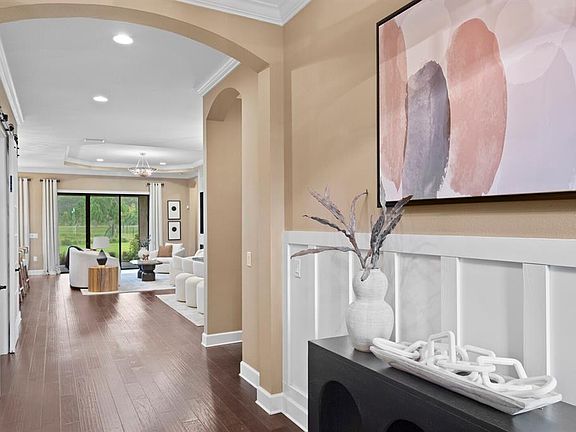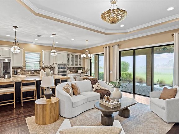 Find the Florida Lifestyle You’ve Been Looking For. You’re searching for more than a house; you want a peaceful retreat that’s beautifully designed, energy-efficient, and move-in ready. A place where your family feels safe, comfortable, and connected to nature, all within a vibrant resort-style community. 3214 Forsythia Drive is here to help. Tucked inside the gated Esplanade at Starkey Ranch, this upgraded 3-bedroom, 3-bath home sits on a tranquil conservation lot with panoramic pond views. With over 2,300 sq. ft. of open-concept living space, it’s thoughtfully designed to help you enjoy every day to the fullest. The home welcomes you with stunning curb appeal, a pavered driveway, barrel tile roof, and a Tesla Wall Connector for your EV. Inside, soaring tray ceilings, wide-plank wood floors, and natural light set the tone for relaxed luxury. The chef’s kitchen offers quartz countertops, stainless steel appliances, gas cooktop, double ovens, and an oversized island perfect for entertaining. A custom pantry and designer finishes round out the space. Feel good every day with whole-house water filtration and softening; great for your health, home, and appliances. And with a professionally monitored security alarm system, peace of mind is built in. Enjoy morning coffee or sunset dinners on your covered lanai, taking in quiet lake views. Inside, the custom built-in media cabinet in the great room adds both beauty and function. The owner’s suite is your private sanctuary, featuring large windows, a walk-in closet with custom storage, and a spa-like en suite bath with dual vanities and glass walk-in shower. Two additional bedrooms are set in a private split layout, perfect for family or guests. A dedicated office with French doors, laundry room with built-in cabinetry and sink, and crown molding throughout elevate the everyday living experience. Live Where Every Day Feels Like a Getaway; Esplanade at Starkey Ranch offers a true resort lifestyle; clubhouse, fitness center, pool, tennis, pickleball, and trails, with easy access to top-rated schools, parks, dining, shopping, and Tampa International Airport. Ready to make your move? Schedule your private showing today and step into the Florida lifestyle you’ve been waiting for.