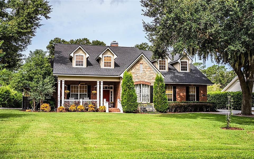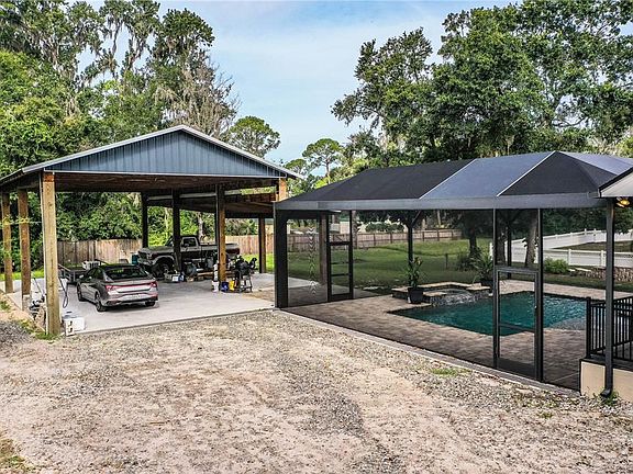 This distinguished residence in the Gardner Oaks neighborhood offers 4,309 square feet of refined living space with five bedrooms and three full bathrooms with two half baths. The two-story brick home blends elegance and comfort with hardwood, tile, and Berber flooring, custom features, and beautifully landscaped outdoor spaces including a pool and spa. The entry opens to tile floors and an office with French doors, while the dining and living rooms share a double-sided fireplace and open through French doors to the lanai. The kitchen is a chef’s delight with custom cabinetry, granite countertops, tile backsplash, walk-in pantry, updated appliances, and a pot filler. The custom laundry room features a washer and dryer, granite sink, folding and hanging areas, and a pet washing station. The main-floor master suite includes hardwood floors, a double tray ceiling, walk-in closet, and en suite bath with dual vanities, soaking tub, and walk-in shower. Two additional downstairs bedrooms feature hardwood or carpet flooring, elevated ceilings, and ceiling fans, and a Jack and Jill style bathroom between the rooms. Upstairs, a spacious theater and game room is complete with surround sound, Berber carpet, custom granite bar, wet bar, and mini refrigerator. Two more bedrooms with walk-in closets and a full bath complete the upper level. Outdoor living is a highlight with a front porch featuring brick pavers, railing, ceiling fan, and red front door, while the backyard retreat includes a screened 15x25 custom sport pool with sun shelf and LED bubblers, a 4x8 spa with jets and feature lighting, and a 38x16 paver patio accessible from the living room, kitchen, and master suite. An outdoor movie projector with sound offers unique entertainment by the lanai or pool. In addition to the two-car garage, an additional single passthrough garage/shop with a half bath provides space to house a third vehicle, lawn equipment, or workshop. Additional amenities include a 24x48 open pole barn with a 14x36 lean-to, metal roof, and reinforced concrete flooring, plus professional landscaping with up-lighting in the front and back yards. This home truly combines elegance, comfort, and resort-style amenities in a premier location.
