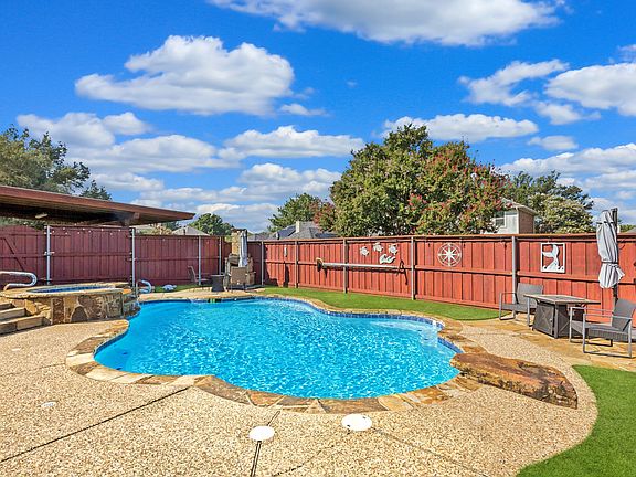 Prepare to be impressed by this beautifully updated and meticulously maintained 4-bedroom, 1-story home featuring a sparkling pool, spa, and a thoughtfully redesigned layout that blends style and functionality. Open-concept layout with a spacious family room that flows seamlessly into the updated kitchen—complete with granite countertops, recessed lighting, and a huge walk-in pantry. The home has been freshly painted and features 7-inch baseboards (excluding secondary bedrooms), crown molding in the living room and primary suite, and plantation shutters throughout. The living spaces have been smartly reconfigured: the former secondary dining space was enclosed to create a true home office, and the second living area has been transformed into a formal dining room that enhances the home’s flow. Luxury vinyl plank flooring is throughout most of the home (carpet only in secondary bedrooms). Beautifully redone fireplace with stacked stone and marble, smoothed ceilings (popcorn removed), updated decorative lighting and a replaced patio door and storm door. Solar screens were added to the front of the home for sun protection and energy efficiency. All systems have been well maintained, including a newer water heater, a replaced pool heating element, twice-yearly HVAC servicing, and a security camera system. A transfer switch has also been installed for easy generator hookup, and a tornado shelter pod is built into the garage. Step outside to your private, low-maintenance backyard oasis—complete with artificial turf, a security gate between the patio and pool, a built-in fireplace by the pool, and upgraded landscaping. The exterior has also been freshly painted. One of the standout features is the grandfathered-in carport, offering extra covered parking—a rare find in this community. The location is unbeatable, with walking access to restaurants, trails, parks, and more! Don’t miss your chance to own a move-in ready, beautifully updated property in a prime location!