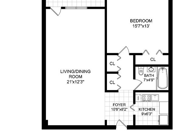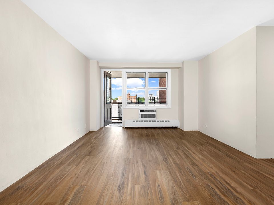 pon entering this one-bedroom apartment, you will find a living room area. The living room has a door that leads to a balcony with northern views of Downtown Brooklyn and Manhattan. The apartment includes multiple closets and is available for occupancy. It is located two blocks from the 2/5 train at Flatbush Junction and Brooklyn College, with shopping options nearby such as Target, Homegoods, and Aldi.