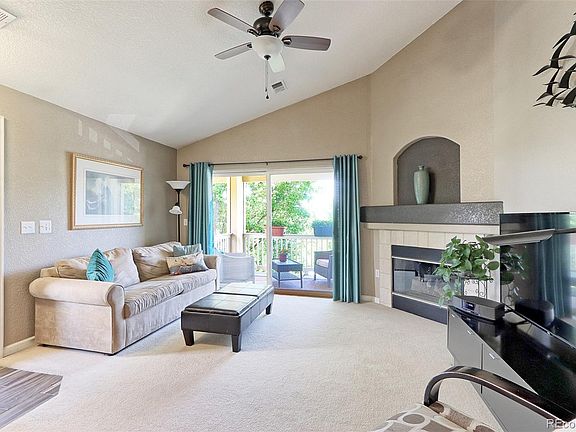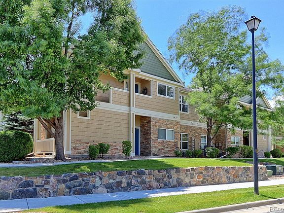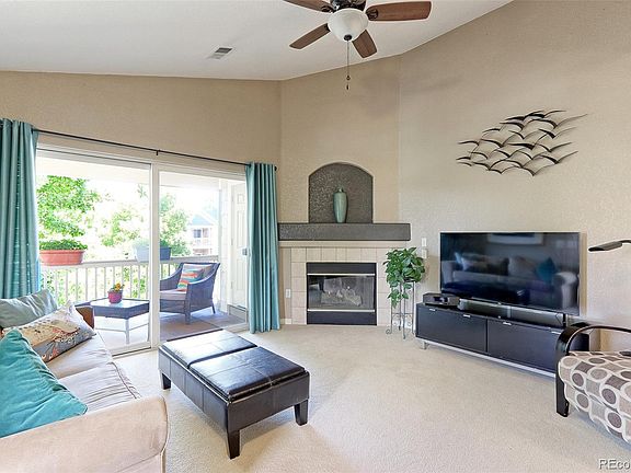 A remodeled gem in the heart of Broadland's Boulders Condominium Community. This corner unit is nestled amongst mature landscaping and boasts views of the treetops above and well maintained green belts below. The Boulders community enjoys access to a fitness center, community pool and numerous playgrounds throughout the neighborhood. The Broadlands golf course is moments away as is walking trails, water reservoirs, Paul Derda Recreation Center, Legacy High School, shopping and restaurants. Enter the home and enjoy a spacious family area with vaulted ceilings. Natural light illuminates the space through an expansive sliding glass door. Exit the glass doors and you'll find a perfect spot to relax and retreat on a private covered patio surrounded by mature trees. Back inside, there is a wonderfully sized and open dining area with upgraded lighting that sits just off the home's remodeled kitchen. Solid white quartz countertops cover the surface of the lower cabinetry offering an abundant work area for food preparation and service. Gorgeous upgraded tile work in a complementary color palette soars from the counters to the ceiling and offers a modern aesthetic to the space. Stainless steel appliances, after market hardware and lighting round out updated design.