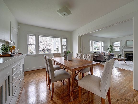 The main level showcases beautiful hardwood floors and original built-in storage cabinets. Large windows fill the space with natural light, and the open dining area connects seamlessly to the updated kitchen, complete with a convenient cafe door.