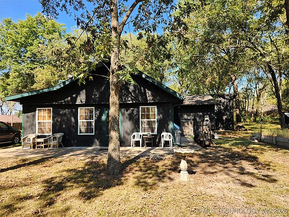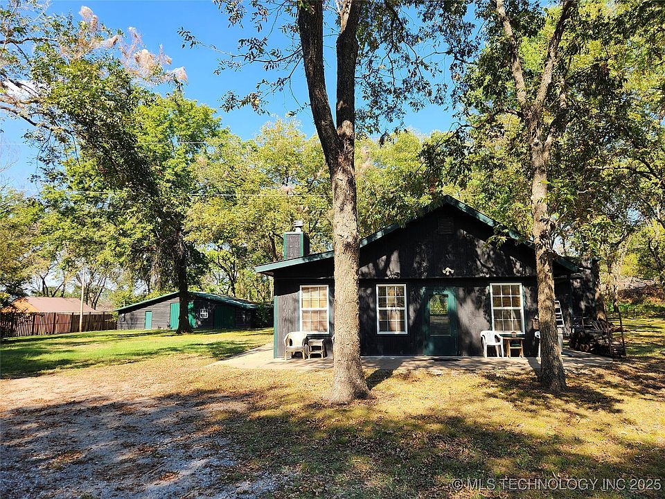Nestled on 2.5 peaceful wooded acres (+/-) just minutes from Lake Hudson, this charming 2 bedroom, 2-bath home offers the perfect blend of tranquility and convenience. Surrounded by mature trees including stately pecans, the property delivers a private, serene setting ideal for relaxing or weekend getaways. Step inside to a spacious great room featuring a cozy woodburning fireplace, perfect for gathering or entertaining. The quaint kitchen carries a warm, inviting feel with plenty of storage. The large primary suite offers comfort and relaxation with a private bath complete with jetted tub. The other full bath offers a walk-in shower, and the loft area would be ideal for a 3rd bedroom if wanted. Enjoy the outdoors from the patio located in front of the home or from the large covered back porch, overlooking the beautiful, wooded landscape. A large garage/workshop provides ample space for storage, hobbies or projects. If you're looking for a county setting that offers peace and quiet, you will want to check out this charming home nestled in the woods and ideally located to town and lake living.