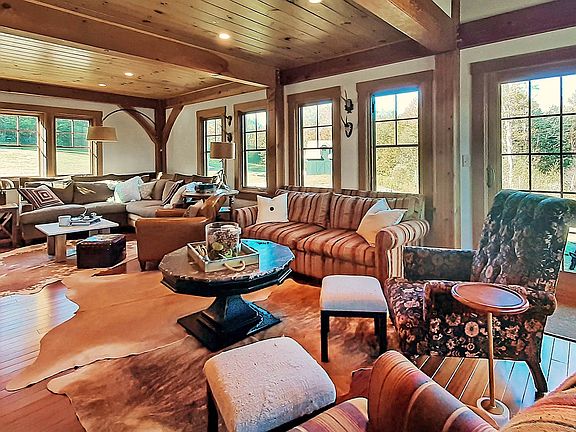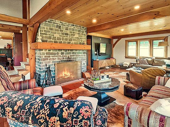 Private Retreat on 90+/- Acres out in the Country. Discover this Custom Post and Beam Home with pastoral setting at the top of a winding driveway. The Living Room is anchored by the floor to ceiling stone wood burning Fireplace. Ample windows bring in the light. The Hardwood floor with radiant heat will keep you warm and cozy. Well-appointed dine-in kitchen will make cooking a pleasure. Upstairs is the master bedroom boast a vaulted ceiling, sitting area and private bath. The other upstairs bedroom also has a private bath, Palladian window and cozy alcove at the top of a ship's ladder. The lower level features a Rec Room and private bath. The laundry is conveniently located in the Mudroom. Relax in the hot tub and enjoy the long range mountain views from stone patio. Trails for snowmobiling, hiking or snowshoeing throughout the 90+/- acres . Store your recreational "toys" in the multi-level barn. A pond completes the serene setting.