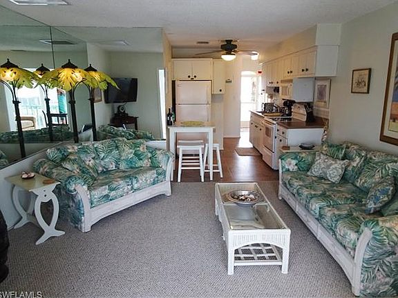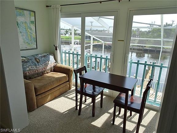 One bedroom 1 bath condo, second floor, end unit, located in the heart of St. James City. One of the larger units in the complex with private entrance, new central A/C, new carpet. Being sold furnished turnkey. Great views of the screened in community pool, canal, and sunsets, from the sitting area off the living room with large sliding windows. Dock included. Quick access to the Intracoastal and Gulf of Mexico beaches. Great rental history. The perfect winter getaway close to restaurants and bars, stores, boat ramps, and marinas.