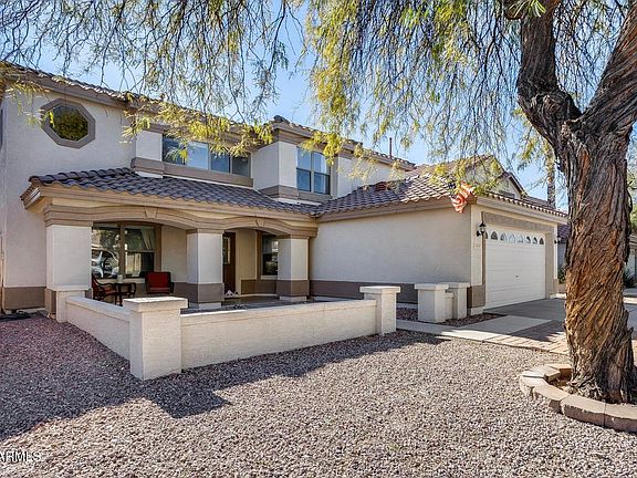 This two-story 4 bed / 2.5 bath home offers comfort and functionality from the front porch to the back. Upon entering, you are welcomed with a family room and formal dining area that flows into the spacious great room with a gas fireplace. The kitchen features a large center island and a breakfast nook with French doors out to the backyard. In the low-maintenance yard, the sparkling pool is the focal point, along with artificial turf, pavers, and a covered patio. Additional features of the home include a versatile den downstairs and loft upstairs, wood-look tile flooring, soft carpet, neutral paint, high ceilings, and sunscreens on the windows. This home is truly perfect for relaxing and entertaining!