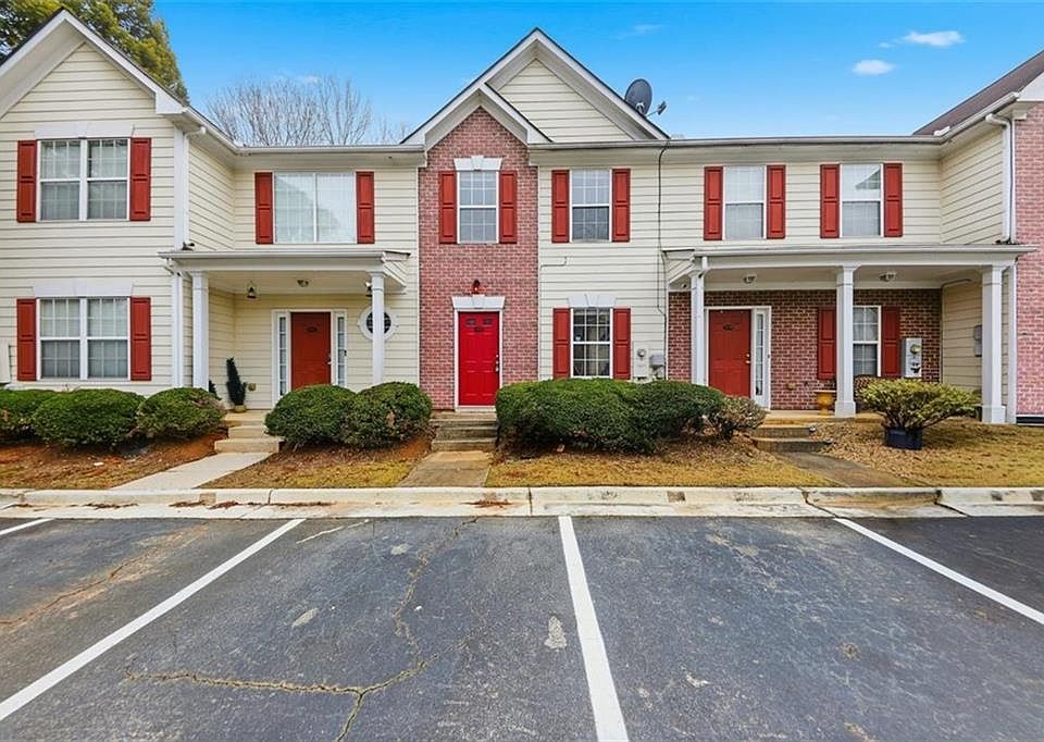 Well-maintained 2-bedroom, 2.5-bath townhome featuring double primary suites and vaulted ceilings. The open main level offers a spacious living area with a cozy fireplace, updated lighting, and durable flooring throughout. The kitchen provides ample cabinet space and flows easily into the living area—ideal for everyday living or entertaining. Both upstairs bedrooms feature private en-suite baths for added comfort and privacy. Enjoy outdoor living with a private concrete patio and additional exterior storage room. Peace of mind comes with newer HVAC systems and low-maintenance living, as the HOA covers grounds maintenance, exterior structure, sewer, termite, trash, and water. Conveniently located near I-285, shopping, dining, and the airport.
