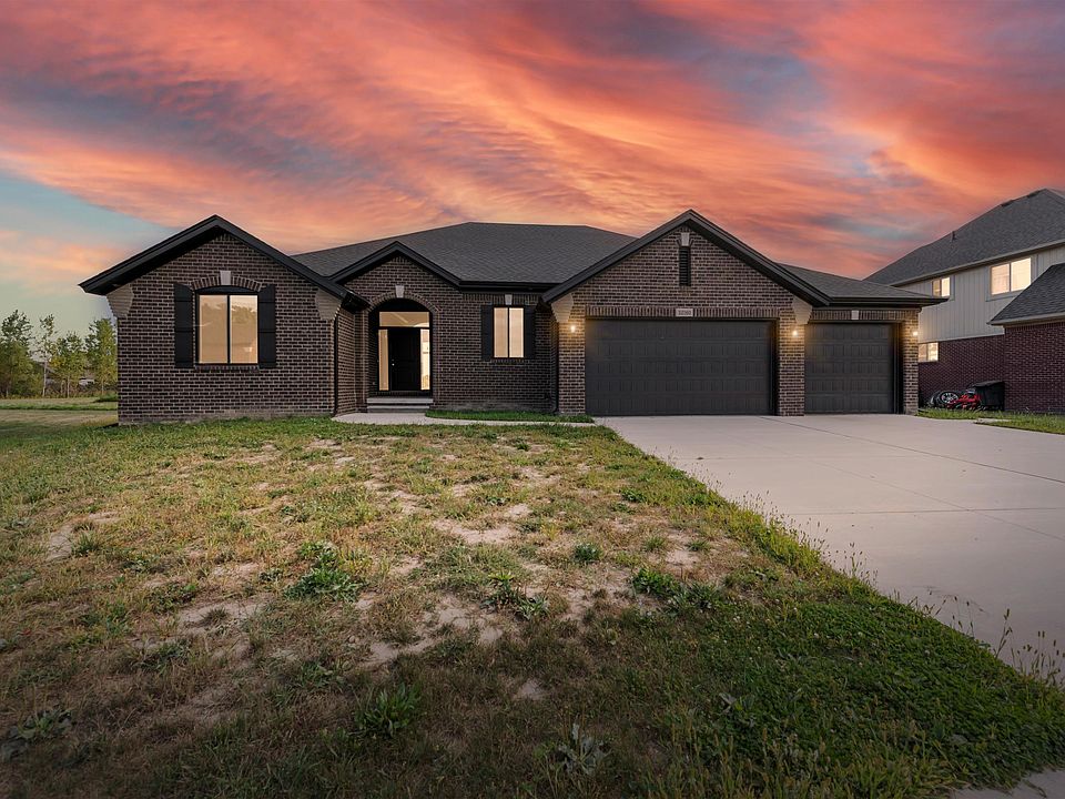 Ideal Location in Burgess Estates! Ranch w 3-Car Garage w/ Bonus 4th Garage Bay & Dual Doors opening to your Backyard while a Side Entry Service Door adds additional function to the over-sized three car space. Set on a Cul-de-Sac style lot! Luxury meets practicality in this home's wide open Chef's Kitchen featuring a massive Granite Island & wide Pantry. Elegant soft-close Cabinetry gives this home a sophisticated appeal. LVP Flooring ties together the Dining & Great Room features Extra-large windows accented by transoms that amplify the open space while bringing a ton of natural light into the home. Crisp dove gray walls accented by gloss white Casements, Moldings & Crown throughout along with a marble surround Corner Gas Fireplace serving as a focal point to the airy, Great Room constructed with a dramatic Tray Ceiling. Master En-Suite is designed discreetly away from the other two bedrooms while the Laundry Room is offers a huge window and ample space. A gorgeous Wood & Iron Banister invites your eyes to the Lower Level Stairwell leading to a Basement w Daylight / Egress window to serve as your 4th Bedroom. 1-Yr Home Warranty Included!