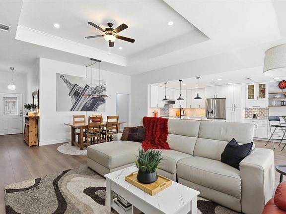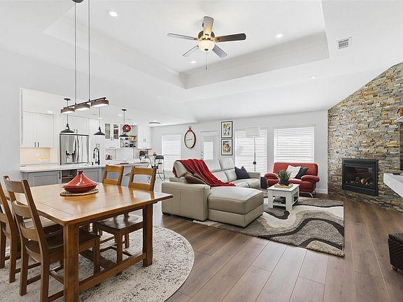 Beautifully transformed 4 bed, 2 bath home that truly stands out for its design and detail. Every inch of this Eagle Ranch home has been reimagined with a modern yet inviting style. Photos do not do this home justice, a must see in person to fully appreciate! The open floor plan features LVP flooring through the main living areas and oak floors in the bedrooms. Floor-to-ceiling faux-stone gas fireplace and custom lighting throughout. The fully remodeled kitchen was redesigned with all new cabinetry including added counterspace and additional cabinets extending into the breakfast area, creating extra storage and the perfect coffee bar! Finished with quartz countertops, an expansive breakfast bar and upgraded stainless appliances, this kitchen is as functional as it is beautiful! The privately positioned primary suite offers a fully remodeled bath with dual sinks, new cabinetry, a freestanding tub, walk-in shower with stainless multi-head tower and elegant backlit mirrors. Enjoy outdoor living with a freshly painted deck, newly stained fence and beautifully landscaped front and back yards, complete with a lemon tree! Additional features include a storage building, sprinkler system and new exterior paint. New AC in 2021. New water heater in 2023. Residents of Eagle Ranch enjoy access to a fishing pond with gazebo, parks, playgrounds, and walking trails.