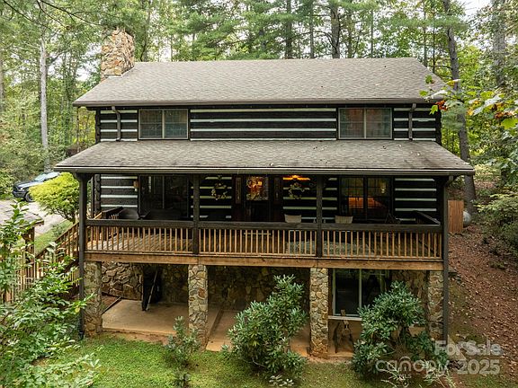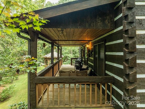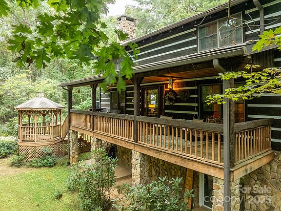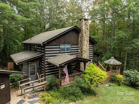 If you are searching for a private, mountain-style retreat that feels like you are worlds away, but in a prestigious subdivision, look no further. This authentic 3 bedroom, 2 bath log cabin nestled on 1 1/2 acres +/- has all the feels--from the moment you turn into the winding driveway, you will be enchanted by the wooded setting. Once you reach the home, you will fall in love with all of the outdoor natural seating areas, such as the covered porch that expands the length of the home, a picturesque lighted gazebo, an enclosed heated/cooled back porch, and a pretty garden area in the back yard. Inside, the home, the main level is open and spacious with ceilings that soar to the 2nd level. The gorgeous fireplace in the living room sets the mood for cozy evenings. There is a bedroom and bathroom on the main level, plus 2 bedrooms & another bathroom upstairs. The loft is a wonderful flex space for your own personal preferences. The basement also provides a finished flex room, plumbing for a bathroom & kitchenette. Tons of updates & improvements inside & out, such as an 18 seer heat pump, water heater, stain & treatment on exterior of home, new roof on dbl garage, & more. Double detached garage & storage building provides additional storage for vehicles, lawn equipment, etc. You will love the surrounding area that boasts beautiful & upscale neighborhoods in a country setting. Bring your golf cart to take advantage of the various amenities of Cedar Rock Country Club just across the road, like golf, tennis, swimming, social events, dining & more. No city taxes. No HOA. Just a few minutes to town. Easy access to the Blue Ridge Mountains, Charlotte & Asheville.