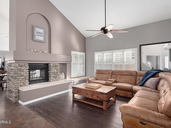 Nestled on a corner lot in the Ahwatukee's sought-after Lakewood-Valencia Shores subdivision, this two-story home is charming inside & out. The home boasts 3 bedrooms/2.5 baths with north-south exposure. As you enter, be greeted by a two-way stone fireplace that serves as the centerpiece for living room, family room, and dining room integrating well together for daily living as well as entertaining. Wide plantation shutters are on every window. Downstairs bedroom can be a separate office or guest room.