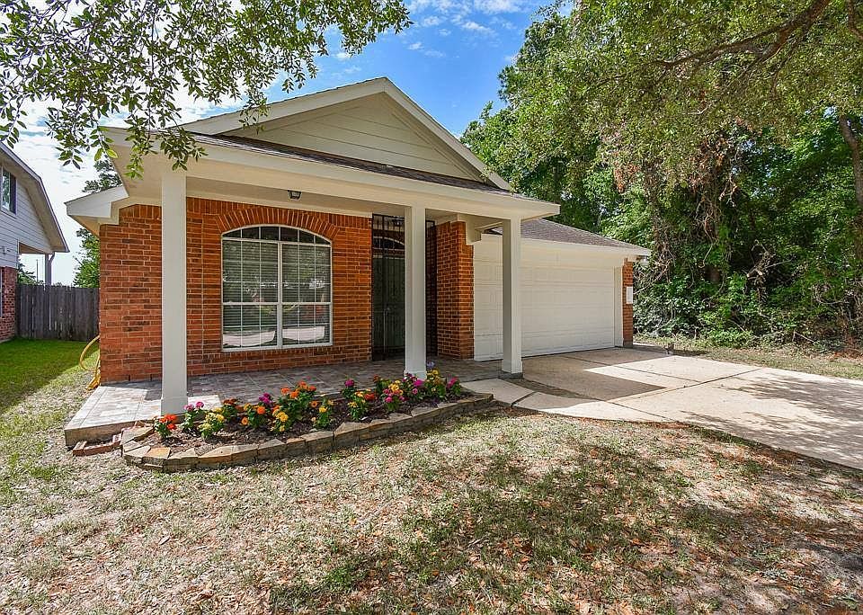 Welcome to this beautifully maintained 3-bedroom, 2-bath, 2-car garage home nestled in a quiet Fully Gated North Houston neighborhood. From the moment you arrive, you'll love the inviting covered front porch—perfect for relaxing evenings. Inside, enjoy fresh interior paint, wood-look laminate flooring throughout, tile in all wet areas for easy maintenance. This home features a versatile study, the large kitchen offers abundant counter space, 42-inch cabinetry, and opens seamlessly to the spacious living room anchored by a cozy fireplace—perfect for entertaining. Retreat to the generous primary suite with high ceilings, a walk-in closet, and luxurious ensuite bath with dual vanities, garden tub, and separate shower. Secondary bedrooms are roomy and well-appointed, offering comfort and privacy for family or guests. Step outside to a large covered back patio—ideal for year-round enjoyment. Plus, enjoy added privacy with no neighbors to the right!