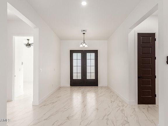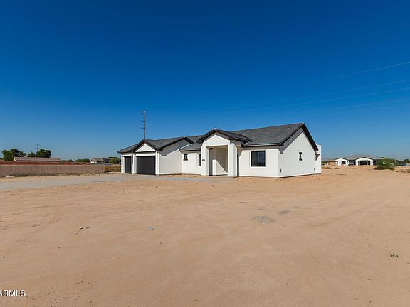 Welcome to this beautiful modern custom home on 1-acre lot, offering the perfect blend of luxury, space, and convenience. This property provides incredible freedom with no HOA, add a RV garage for all your recreational vehicles, bring your horses and animals, or create the custom outdoor setup you've always envisioned. Ideally located just minutes from the I-10, 303, and 101 freeways, you'll enjoy quick access to shopping, dining, and everything the West Valley has to offer while still benefiting from the privacy and openness of true Arizona living. From the moment you enter through the impressive custom iron double doors, you'll notice the attention to detail throughout. The home features custom white oak cabinetry, striking black quartz countertops, stainless steel appliances and 8' modern black Rockport interior doors that elevate the contemporary design. Beautiful tile flooring flows throughout the home, leading you into spacious bedrooms and luxurious bathrooms showcasing custom marble showers. The open layout, high-end finishes, and thoughtful design make every space feel both inviting and refined. Outside, the extended back patio offers the perfect setting for relaxing or entertaining with wide-open views. With a three-car garage, a brand-new well, and no HOA, this property provides exceptional flexibility to personalize and expand. Opportunities to own a modern custom home on land like this are rareexperience the freedom to make it truly your own.