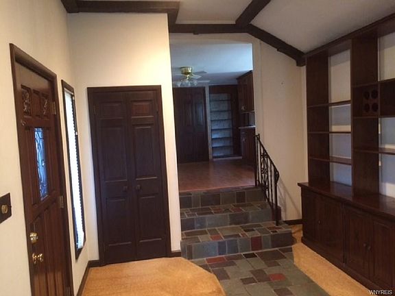 This home is a 2 BR ranch with a bonus room above used as a BR by the family. Sprawling eclectic interior with 2 fireplaces one gas one wood NRTC. Lots of dark wood greets you as you enter the slate floor foyer. To the right is the family room/dining room w/gas fireplace and stone wall. To the left the gorgeous cherry kitchen w/Corian countertops and Shrock cabinetry. Sliding doors lead to concrete patio from both the kitchen and family room. Mstr BR has .5 bath, 2 BR down hardwood floors. Huge living room has wood fireplace. A generous breezeway has tons of storage. The garage is oversized and has a footer down to frost line. Bonus room upstairs has access to more storage under the eaves. The yard is 2.4 acres of mature trees where nature abounds. Desirable Alden schools!