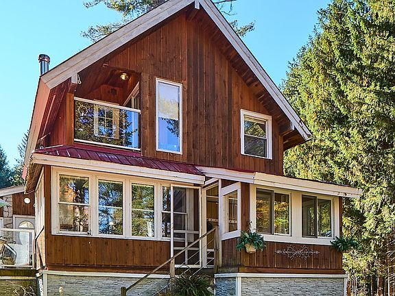 Quiet roadChalet-inspired designWarm wood heatAiry sleeping loftsLarge windowsSunroom off the kitchenJuliette balcony