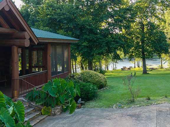 Stone fireplaceWide lawnWrap around porchesOpen vaulted ceilings