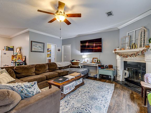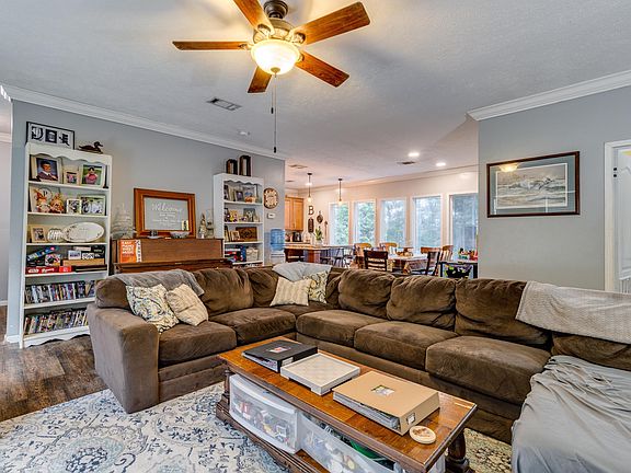 Step inside to a large living room with a cozy fireplace that flows into the dining area and an impressive kitchen featuring a massive overhang island with barstool seating, a stainless-steel farmhouse sink, and abundant cabinetry. Five expansive windows line the kitchen wall, filling the space with natural light and offering beautiful views of the property. Just off the living room, the generous laundry room provides access to a screened-in back porch, an open patio area, and a fire pit—perfect for relaxing or entertaining. Down the hall are three sizable bedrooms with walk-in closets and a full bath. To the left of the front entrance, the private primary suite offers a walk-in closet and a spa-like en suite with a double-sink vanity, a large dual-head tiled shower, and a separate soaking tub. This double-wide home sits on 5 peaceful acres with a gravel driveway, an attached two-car carport, and abundant wildlife—ideal for anyone seeking quiet country living.