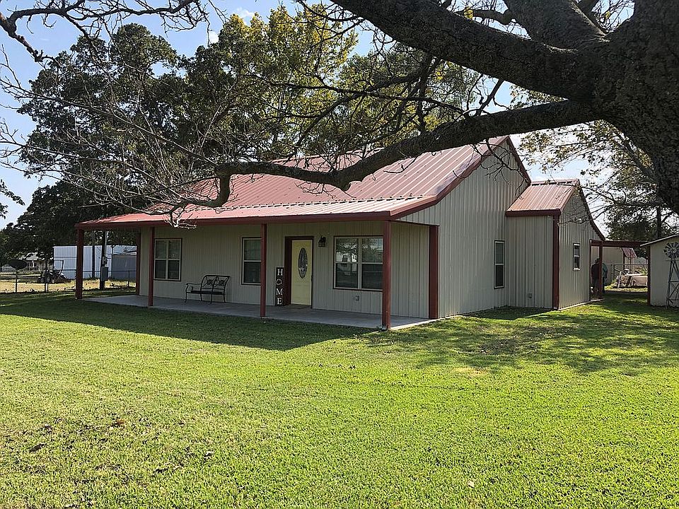 -Under Contract- 1,524 sqft 3/2 metal home built in 2015 for sale Bowie, TX. The house sits on 0.88 acres outside of the city limits and on Wise Electric. This home has many extras which includes detached two car garage with work room, carport, storage building, loafing shed, cellar, smoker, pergola, sprinkler system, tankless water heater, and much much more. Priced at $220,000 please call 940-366-9338