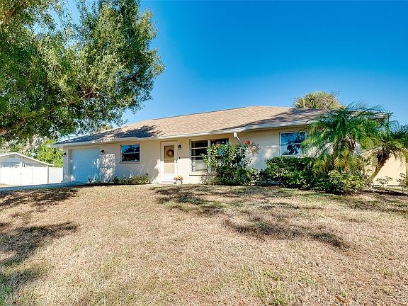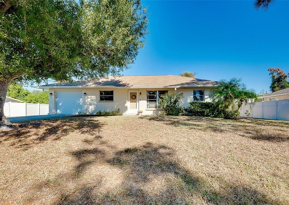 YOU FOUND IT! A true hidden gem will be yours in this pristine 2-bedroom, 2 bath home situated in a very quiet South Venice neighborhood on a dead end road. Challenger Park is directly across the street also. This home boasts a newer roof-(May2022), kitchen, bathrooms, tile flooring, and totally private back yard with sizeable shed for storage. The cathedral ceiling greets you upon entrance, as does the ambiance of the tasteful wood accents in the living room. There is ample room for enjoying family and friends in this light enhanced space. A modern kitchen is steps away and presents contemporary white cabinetry, granite counters, closet pantry, and stainless-steel appliances. An adjacent dining area allows for daily or formal meals while enjoying the view of the private tropical backyard. Double sliders lead to lanai that extends your living space. An additional paved patio lends itself to multiple uses. This private tropical backyard has a large shed with new metal roof for additional storage. A light-flooded primary suite can hold king-size furniture and has a sizeable walk-in closet. The ensuite bath includes a tub/shower combo and modern vanity with granite top. The opposite side of the home finds the second bedroom. Currently shown with a single bed, this room can hold two twins or even bunk beds. The secondary bath includes a step-in shower and modern, granite top vanity. The one car garage holds the laundry with additional sink, and also has plenty of room for your vehicle and storage. This home, with its proximity to the park, also has a private deeded beach which can be accessed via Ferry for an optional fee. Enjoy all that Venice has to offer, beaches, historic downtown Venice, fine dining, and the new Wellen Park Downtown when you make this home your own. Schedule a private showing today.