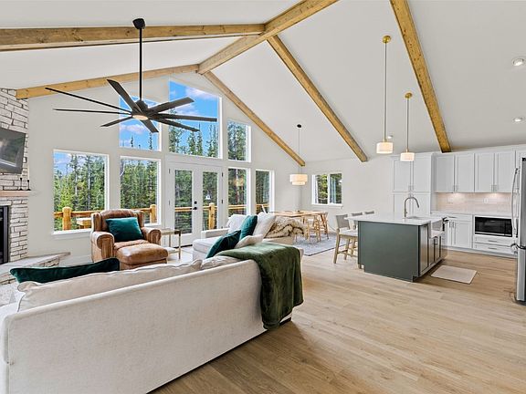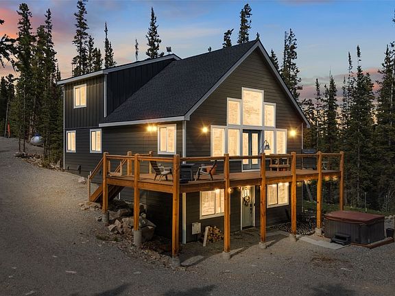 Built in 2023, this modern mountain retreat blends style, comfort, and functionality with high-quality finishes throughout. The open-concept great room welcomes you with soaring ceilings, exposed beams, and a striking stone gas fireplace. Natural light floods through the wall of windows, showcasing the surrounding forest and filling the space with warmth. The custom kitchen is a chef’s delight, featuring quartz countertops, sleek tile backsplash, high-end stainless appliances, floating shelves, and an oversized island with seating. Luxury vinyl plank flooring ties the main living spaces together, while a second gas fireplace in the primary suite creates a cozy and private retreat. With 3 spacious bedrooms, 3.5 baths, and a flexible bonus room perfect for a home gym, office, or additional sleeping space, this home adapts to every lifestyle. The beautifully tiled bathrooms and laundry room reflect thoughtful design and modern elegance. The finished lower level is built for entertaining, complete with a wet bar, pool table, and comfortable lounge areas—ideal for hosting guests. Step outside to enjoy Colorado’s four seasons on the Trex decking, relax in the hot tub under the stars, or let pets roam safely in the fenced-in dog run with grass and gravel. Practical details include a wide gravel driveway with ample space for a future garage, a durable Hardie Board exterior for low maintenance, primary shower with built-in water filter, and passive solar design for year-round efficiency. Set on a full acre, this mostly furnished home offers a private mountain setting without sacrificing style. Every detail has been carefully curated, making this a rare move-in-ready opportunity in the high country.