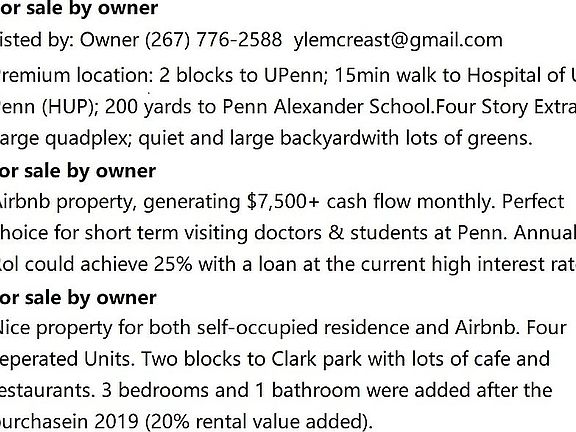 In the heart of UPenn U city. Triplex with a bonus unit, operating as a fourplex. Impressive Airbnb Income of $7,500+ per month. Premium location for visiting students/nurses/doctors/ at Penn Medicine. Substantial equity growth potential. After Repair Value (ARV) 1.3 Million. The owner is leaving the country. Seller's finance acceptance.