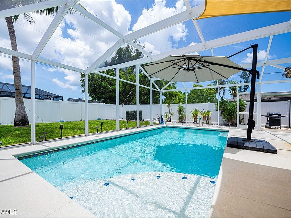 Welcome to your Southwest Florida retreat! This beautifully updated home offers a desirable split-bedroom layout, giving privacy for guests or family. A spacious den with a stylish barn door doubles as a home office, TV room, or third bedroom. The open floor plan connects the living, dining, and kitchen areas for a bright, airy feel, while a vaulted ceiling in the family room enhances the sense of space. Luxury vinyl plank flooring runs throughout for a clean, modern look. The remodeled kitchen is a showstopper with quartz countertops, soft-close solid wood Fabuwood cabinets, 42” uppers, a built-in coffee/bar station, and a sleek downdraft range. Both bathrooms are updated, including a brand-new master shower, and both bedrooms feature walk-in closets. Wide entries (42” front door and 36” master entry) provide easy access. Step outside to your private backyard paradise. Enjoy a heated saltwater pool with full southern exposure, a tiki bar under the oversized screened lanai, custom LED landscape lighting, a 6’ vinyl privacy fence, and an auto-fill pool system. A working well helps offset water costs for pool refills or gardening, while the automatic sprinkler runs on Cape Coral’s dual-water setup. Practical upgrades include a new roof (2023), Low-E windows, gutters, serviced AC (2016), and regular pest control. The oversized garage offers closet storage and an overhead screen, while extras like five flat-screen TVs, washer/dryer, Ring doorbell, and security system add value. Best of all, this home is in a NO flood zone and within a 5-minute walk to Koza Salidino Park—featuring a baseball field, fenced play yard, and open playing field—plus it’s an easy bike ride too. The location is quiet yet just minutes to schools, shopping, restaurants, and everyday conveniences. This one truly checks all the boxes—schedule your showing today!