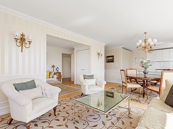 Bathed in natural light, the apartment faces south and west, offering breathtaking views of the Hudson River and Manhattan skyline. Thoughtful upgrades include detailed crown moldings, custom wall paneling, built-in cabinetry, and rich finishes throughout.