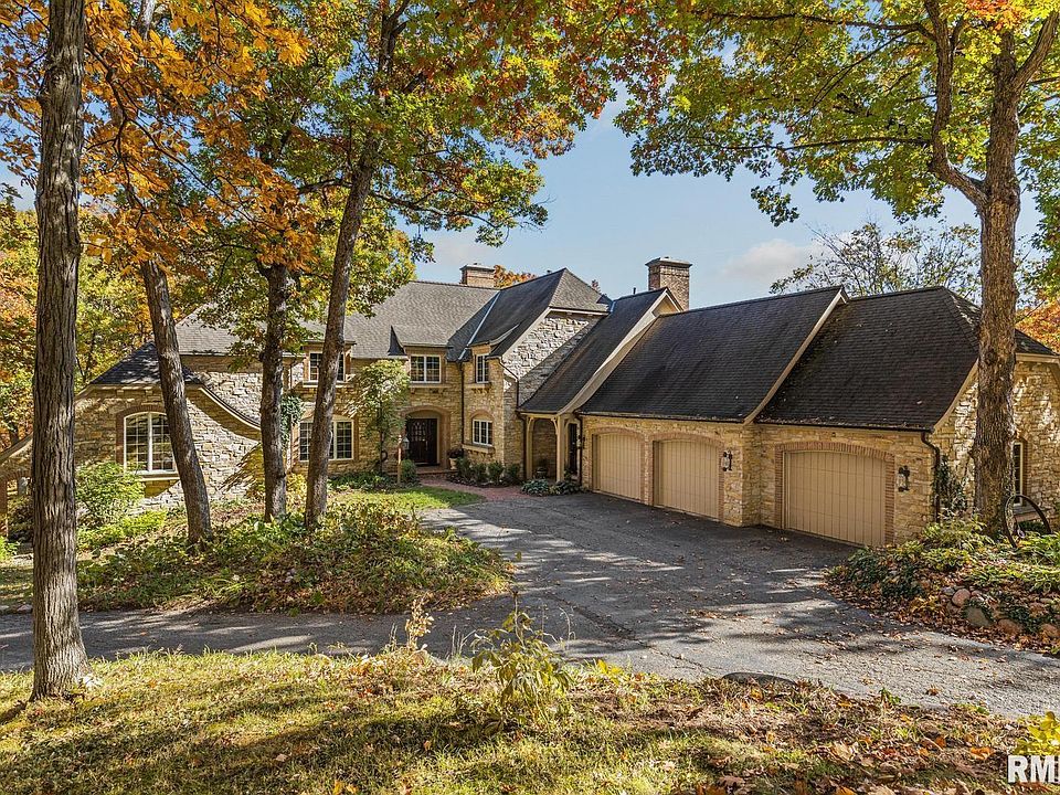 A magnificent home lovingly and thoughtfully built and designed by the sellers along with builder/designer Mark Hoerr, creating a masterpiece. Privately situated on 9.3 acres in Georgetowne subdivision, it has the best of both worlds: privacy, yet not totally isolated. The exterior elevation is stunning with 100% stone and brick, framed with copper gutter and downspouts. The 4,600+ square foot home features a main floor master and guest bedroom en suites and 3 en suite bedrooms upstairs adjacent to a spacious loft gathering area overlooking the great room. The fireplaced kitchen/hearth room features natural wood Roecker cabinets, oversize island and dinette. The Canadian lodge inspired great room boasts a 20-foot, beamed ceiling with limestone hearthed fireplace and windows galore to take in the peaceful wooded views. The walkout basement is full, partially finished with many daylight windows.