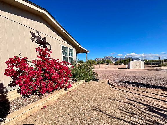 Don't miss your opportunity to own this very special home that boasts with possibilities. Sitting on 1.25 acres with a perfect view of Superstition Mountain, there is room for your horses, toys, and more. Some of the amenities include a 2 horse stall, tack room, hay barn, outdoor outhouse with working plumbing, a 14x40 outbuilding that is pre-plumbed to make into a guest house or bungalow, 30x40 steel garage/workshop, full RV hookup and more! Country living, yet close to all the amenities of shopping, freeways, restaurants and night life. 360 yards to State Trust horse trails, 3.3 miles to Bulldog Canyon OHV trails, P&M Arena is also close by. This home won't last long, view today and make it yours!