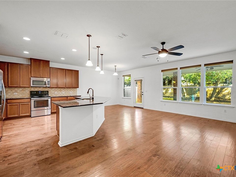 Welcome to Your Next Chapter! This inviting two-story home combines comfort, style, and convenience, offering 5 bedrooms, 3 full bathrooms, and over 2,500 square feet of living space. As you step inside, you’re greeted by a freshly painted entryway and living area, along with the stairway and loft upstairs. The main living spaces feature wood flooring, setting the stage for cozy evenings with family or gatherings with friends. The primary suite is located on the main floor, offering both privacy and convenience. Upstairs, you’ll find three additional bedrooms and a large loft space, perfect for a second living room, game room, or home office. Every bedroom features brand-new carpet, adding a soft and fresh touch. And with three full bathrooms, there’s plenty of space to accommodate both family and guests. Step outside and enjoy one of the home’s standout features: a spacious covered patio overlooking the backyard. Outfitted with two ceiling fans, this outdoor living space is ideal for entertaining, relaxing with morning coffee, or enjoying warm Texas evenings in comfort. Practical updates add peace of mind, including a new roof installed in 2023 and a 2-car garage with added storage to keep everything organized. The home’s location offers unmatched convenience, close to elementary and middle schools, as well as Texas State University. Whether you’re raising a family, hosting visitors, or commuting, this home keeps you close to everything you need. This property blends functionality, thoughtful updates, and a prime location, making it the perfect fit for all lifestyles. From everyday living to weekend entertaining, this home has the space and features to grow with you!
