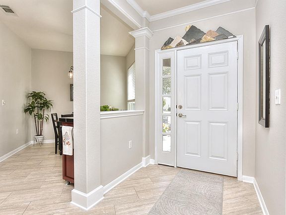 Welcome to this immaculate Monroe floor plan, one of the community's most popular and in-demand layouts. Situated on a large corner lot, this home boasts outstanding curb appeal and offers a wealth of custom upgrades, setting it apart from the rest. The interior showcases modern elegance and function. The kitchen is a true centerpiece, completely updated with granite countertops, stylish painted cabinets, a contemporary backsplash, under-cabinet lighting for task and ambiance, and a custom slate stone facade accenting the breakfast bar and main cabinet run. All primary appliances were replaced in 2023. It is plumbed for gas if that is a preference for cooking. Elegant crown molding accents the entry, main living, and dining areas, complementing the updated tile floors found throughout the kitchen and main living spaces. The bathrooms have been beautifully updated with granite counters, featuring a large, modern walk-in shower in the primary suite. The versatile layout includes a cozy breakfast nook, spacious living and dining areas, a second bedroom, and a study accessed through classic French doors, which includes a convenient built-in bookshelf. Outdoor living is exceptional with an extended, custom back patio and an expansive front yard featuring extensive landscaping, a beautiful water feature, and a lovely sitting area to enjoy with family and friends. An epoxy walkway extends seamlessly from the driveway to the front entry. Practical updates include a Roof replaced in 2019 and HVAC replaced in 2016. For added value, the washer/dryer, main refrigerator, garage refrigerator, and water softener all convey with the home. This is the turnkey opportunity you've been waiting for!