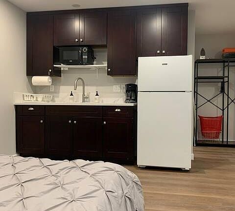 Fully-stocked kitchenetteCompletely remodeled unitOwn private entranceCloset spaceOversized loveseatQuiet studioEfficient heating and cooling
