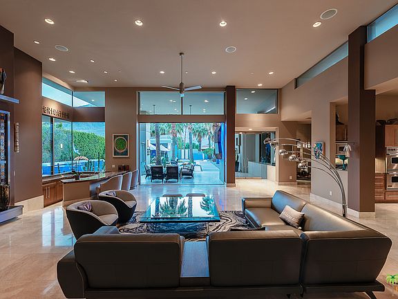 This walled and gated mini estate presents exquisite-yet-casual custom contemporary architecture along with every imaginable luxury convenience, making it one of the finest offerings in all of Palm Springs. Once past the circular driveway and inside the steel and glass gates, you will be amazed by what is truly a property that has been designed for entertaining. In the main house, multiple window walls disappear opening the living room, den/media room, and primary suite to their adjacent outdoor areas, front and back, each with spectacular vistas. Spaces flow effortlessly and are warm and welcoming: Living room with fireplace & sunken wet bar, a kitchen that redefines "gourmet" with its doubled high-line appliances, formal dining, refrigerated wine room, den/media room with built-ins, office with built-ins, primary suite with fireplace and enormous bath, and 2 guest ensuites. Outdoors are TWO casitas each with bath (1 used as a gym, the other with full kitchenette), and the most amazing covered pavilion with kitchen and fireplace. All of this overlooks a mosaic tiled pool and spa and resort-like grounds for entertaining. Ecologically, the home has an OWNED 90 panel/29.43KwH solar panel system all backed up by TWO Tesla Power Walls. Got cars? There are garages for 4! And that's not ALL of the features! Truly the best on offer.