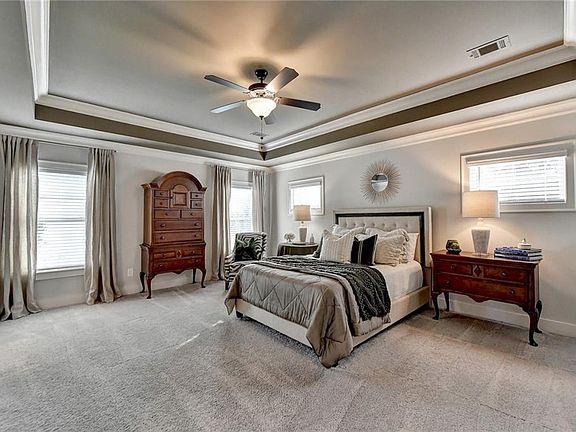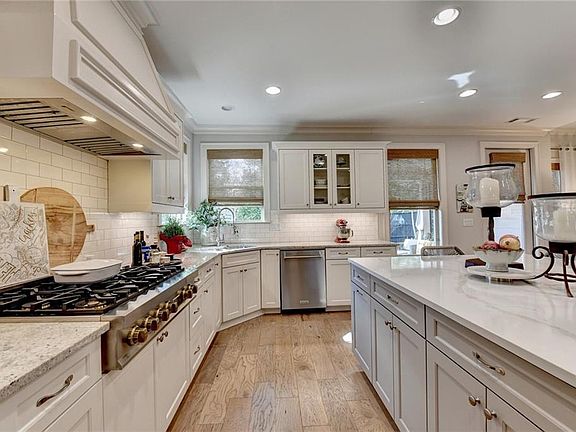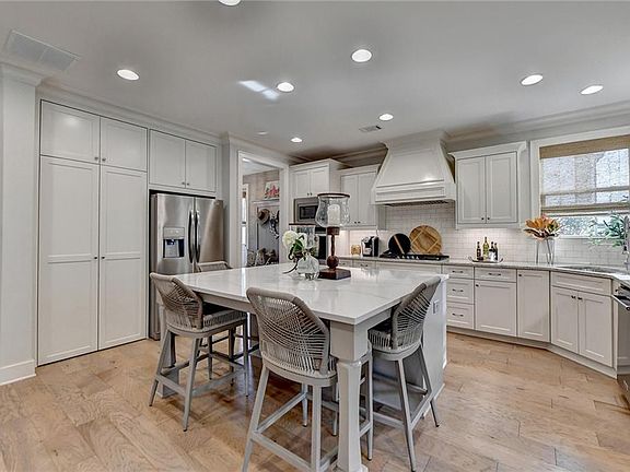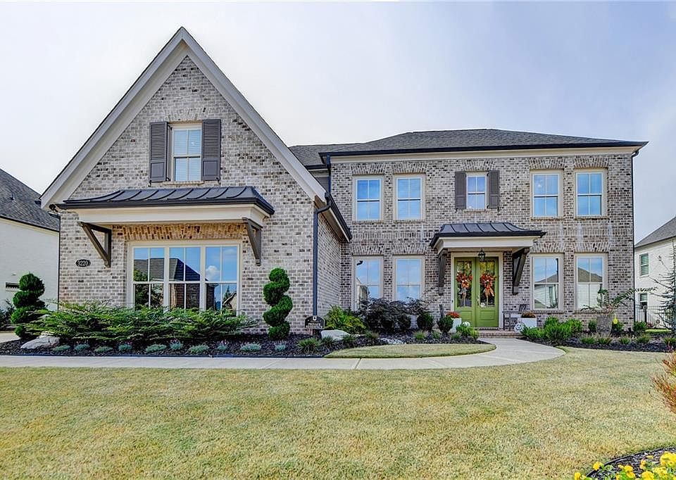 Welcome to the highly desirable Montebello community, where this stunning French-inspired, three-sided brick home awaits. Showcasing the popular Odett Plan, this home features timeless design, luxurious finishes, and thoughtful upgrades throughout. The professionally landscaped front and backyard include an in-ground sprinkler system and architectural up-lighting. Custom shutters and fresh exterior paint give the home a polished look, while an extended driveway and oversized side-entry two-car garage provide plenty of parking. The fully fenced backyard is perfect for entertaining, with an extended covered patio, privacy screens, and lush landscaping. Enter through grand double glass-pane doors into a soaring two-story foyer. The main level is designed for both elegant living and everyday convenience. A formal dining room with a coffered ceiling and a large butler's pantry is perfect for hosting. A private office provides a quiet workspace. The expansive kitchen is a chef's dream, featuring an oversized quartz island, custom cabinetry, a walk-in pantry, and high-end stainless steel appliances, including a six-burner gas cooktop and double ovens. The kitchen overlooks a family room with a stone fireplace, built-in bookshelves, and custom shiplap trim. Engineered hardwoods flow throughout the main floor, which also includes a convenient fifth bedroom and a full bath. Upstairs, the oversized primary suite is a true sanctuary with hardwood flooring and a custom walk-in closet. The spa-style bath offers a soaking tub, separate shower, and dual vanities. Three additional generously sized bedrooms and two full baths, along with a large media/bonus room with engineered wood flooring, complete the upper level. Ceiling fans have been installed in every bedroom for added comfort. This professionally decorated home is move-in ready and has been meticulously maintained by its original owner. Montebello offers unmatched amenities, including a resort-style swimming pool, clubhouse, lighted tennis and pickleball courts, and a three-acre lake. With a prime location near top-rated Forsyth schools, shopping, and dining, this property is a must-see!