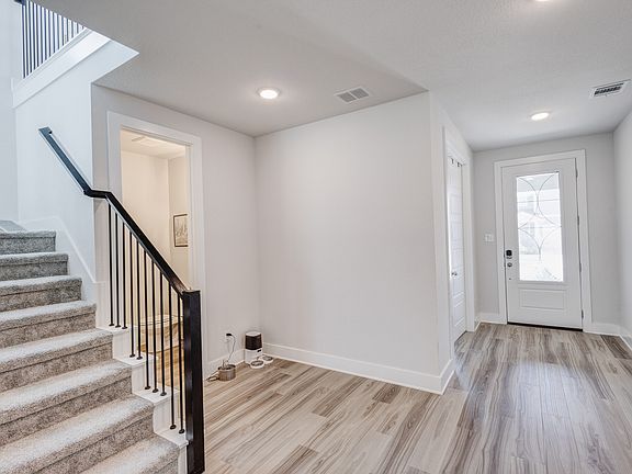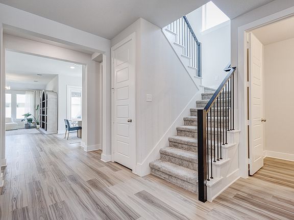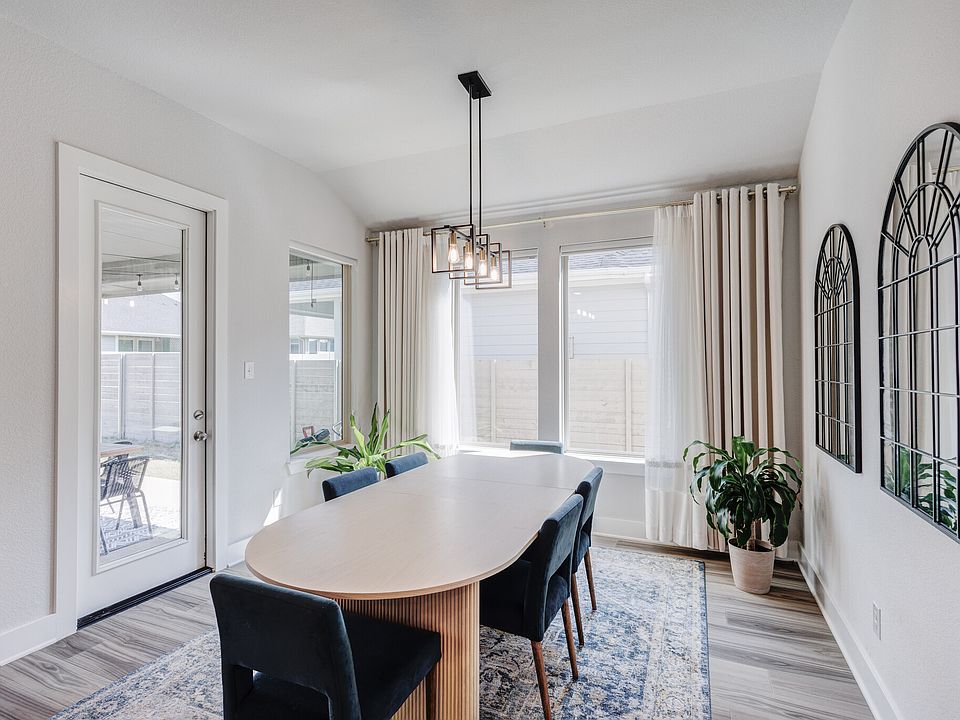 Two story homeContemporary light fixtureOpen floor planLight color wood floorFormal dining roomHome theater media roomCovered patio