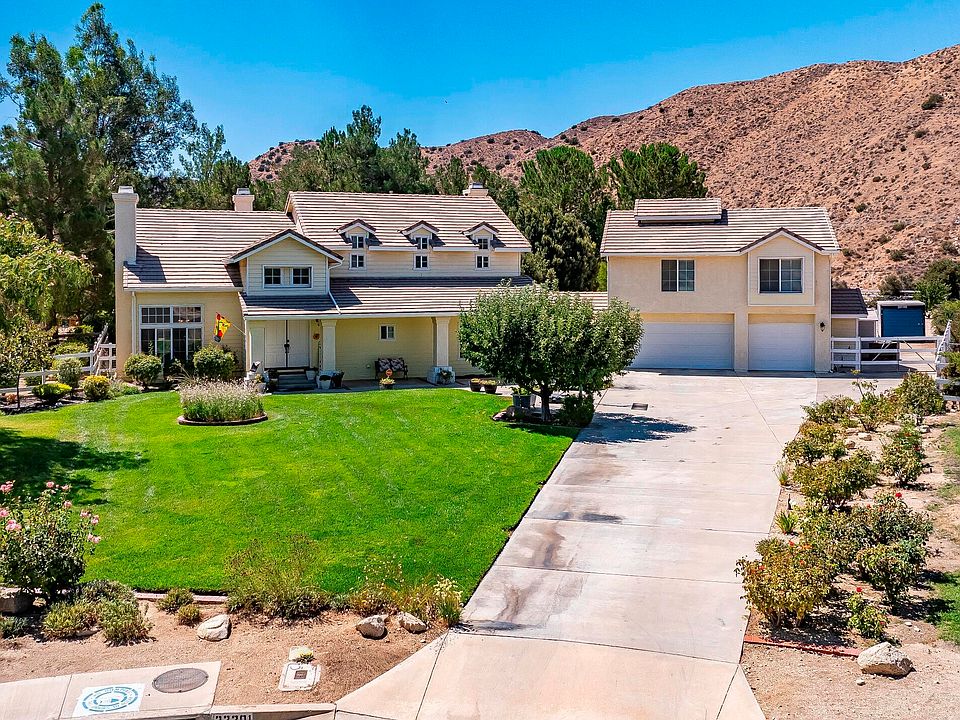 First time on the market! Welcome home to this gorgeous, upgraded, custom two story home, with 5 bedrooms, 3.5 bathrooms (main living quarters), a separate upstairs garage apartment/open loft concept with a full bathroom, on beautifully landscaped acreage, flat equestrian property, RV access for all your toys, a 3 plus car garage, completely fenced in the back, on a cul de sac, nestled against the rolling hills in the sought after Sterling Ridge tract in Acton-making this estate an absolute must see! Walking up the long driveway, you soak in the true beauty of this property. Stepping into the home from the outside, you are greeted by wooden double doors, and a large, tiled entry way that flows seamlessly down the steps and into the home. You are welcomed by natural light, tall vaulted ceilings, spacious rooms, new carpet throughout and new luxury vinyl plank flooring in all of the bathrooms. The grand foyer flows into the open living room, with a fireplace that leads into the formal dining room, all great for entertaining. Moving in to the heart of the home, is the showstopping kitchen with custom granite countertops, center island, warmly stained soft closing cabinetry with new hardware, wood planked tile flooring, upgraded stainless steel appliances-that open up to a dining area right off of the kitchen. There is a spacious and comfortable family room with another brick fireplace for those cool desert days and nights. Downstairs also has a master/primary bedroom (or a home office space) with an attached full bathroom, There is a half powder bathroom for guests, ample sized laundry room, cabinets for more storage, a utility sink, a door to the exterior breezeway that connects to garage, and built-in laundry chute from the upstairs. Transitioning to the upstairs, is the lovely staircase with wooden railing that takes you to the landing of the second story. The sprawling master bedroom greets you at the top of the stairs with double doors, vaulted ceilings, and fireplace. There are two walk in closets as you lead to the master/primary bathroom ensuite with dual sinks, new sink faucets, walk in shower and large soaker tub. Down the hallway, there are 3 more good sized bedrooms and a full hall bathroom. Enjoy spring and summer days in this backyard paradise! Stepping outside onto the back patio, into the stunning oasis in the desert, be entranced by the sweeping views, lush green grass that seems endless, mature trees, plants, flowers in bloom as far as the eye can see. The patio cover is custom and spans almost the length of the house. Moving to the side yard, there is a connecting breezeway that leads you up the staircase with newer railing and newer composite stairs to the garage apt/loft/game area/next gen living space. This open space lined with windows for plenty of natural light-is great for entertaining! It's equipped with a kitchenette, refrigerator, a full bathroom, heat and ac. Below is the massive 3 plus car garage, with 2 Lift Master garage door openers. This property also includes but isn't limited to: built in Generac Generator system with automatic turn on if power outages occur, and an automatically powers off for any gas leak on the generator, new paint on areas of the interior/exterior, added concrete for heavy traffic areas over the years, Quiet Cool whole house fan, recirculating pump, custom window coverings on some windows, new fans, new light fixtures in parts of the home, storage galore, patio cover upgraded, newer rain gutters, paved roads, public water and gas, walking/hiking trails, and so much more! See this home today and start living!