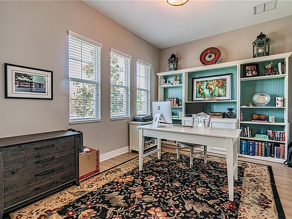 This Executive turn-key home, located in the gated village of Windsor at Meadow Pointe IV, shows like a model and has everything you've ever wanted--and more. The Southerland floor plan offers an open plan, with a den on the first floor, along with an impressive great room, gourmet kitchen, oversized casual dining area, and guest suite. Filled with natural lighting, volume ceilings, cedar planks, and accent walls, each room has a unique decorative touch. Stunning wood staircase and beautiful wood flooring lead you to the 2nd-floor Owner's Retreat, loft (with wet bar, quartz countertops & sitting area), bonus room (theater stage w/quartz countertops), laundry room and secondary bedrooms. The large Owners Retreat, w/coffered ceiling & tranquil view is perfect after a long day. Master bath boasts clean, white cabinets, with granite countertops, tiled garden tub and walk-in shower, and large walk-in closet. Outside, you'll enjoy your own private Florida oasis. Oversized patio with travertine tile, outdoor kitchen, and gorgeous 18,000-gallon saltwater pool w/screened enclosure overlooking conservation makes this perfect for entertaining or just relaxing. Double ceiling fans keep a nice breeze on those humid days. Welcome home. Windsor at Meadow Pointe is conveniently located near the interstate, medical centers, schools, shopping, and reastaurants. Amenities include a clubhouse, pool, fitness facility, and sporting courts.