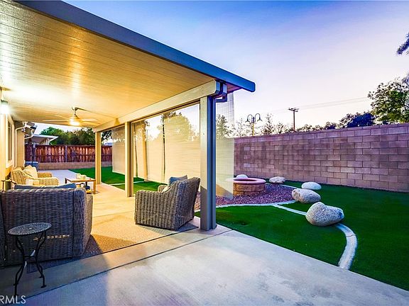 Enjoy your private backyard retreat with professional landscaping, drainage, covered Alumawood patio with ceiling fan, fire pit, and peaceful views.