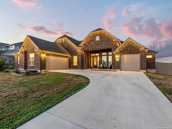 Stunning 1.5 story home in a gated community featuring 4 large bedrooms (one could be an inlaw suite - perfect for multigenerational living), 4 full bathrooms, 2 half bathrooms, a 3 car garage and more. This home is every chef's dream with two kitchen islands w/ breakfast bar, a large pantry, and tons counter space. The home also features a family room w/ custom, built in shelving, a faux electric fireplace, a vaulted ceiling, and a study. Upstairs you will find a game room and a media room w/ surround sound. The master bedroom has a large walk-in closet, and a sitting area leading to the backyard. The master bath features his & her vanities, a Texas-sized, mudset walk-in shower, and a freestanding tub. All secondary bedrooms on the first-floor feature walk-in closets. Outside, you will find a TEXAS SIZED lot featuring a resort style pool, a covered & screened patio w/ a fireplace, extra patio area with storage shed and still plenty of yard space left to enjoy. This is truly the perfect family home! Situated just outside Cibolo/Schertz in Guadalupe County, Harvest Hills is centered in what is becoming the golden triangle of commerce and development for the area. Easy Access to I-35, I-10, and FM-46. There are NO city taxes! Harvest Hills offers amenities including a top-flight amenity center w/ clubhouse, entertainment center, pool, basketball & tennis courts, and children's playground. There is also a catch & release fishing pond w/ pier, livestock pens for 4-H members, and RV storage facilities available for homeowners. Come take a look. Where luxury and country living come together to afford the perfect lifestyle! You will fall in love!