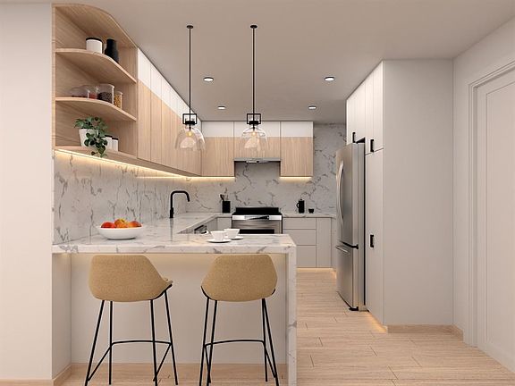 cabinetry, waterfall-edge quartz countertops, and brand-new stainless steel appliances. Enjoy panoramic