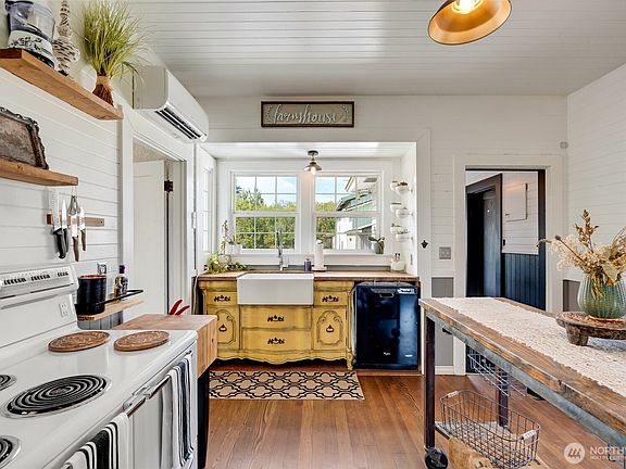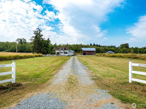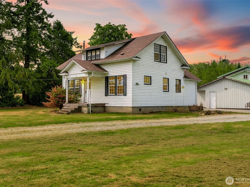 NEW PRICE & $10K towards buyer closing costs. Charming 1923 farmhouse on 8 acres. A rare opportunity with endless possibilities. Step into timeless charm with this well-maintained farmhouse offering 1390 sqft of living space. This 3-bedroom, 1 bath home features a main floor bedroom and bath, perfect for easy living. Outside, the property shines with fruit trees, a 4-bay shop complete with second story and heated floors, classic barn full of character, and a combined covered parking for 7 vehicles-ideal for hobbyist, collectors or anyone needing extra space. Out back is a spectacular stamped patio, great for entertaining or just relaxing. Primarily flat acreage is ideal for horses or farm animals. New roof & windows in 2017.