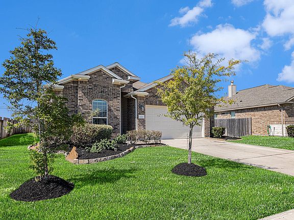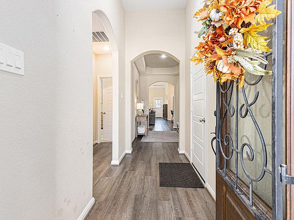 Stunning one-story home in the highly sought-after Stone Creek Ranch community! This impressive residence features 4 bedrooms, 2 full baths, an oversized 2-car garage with a half bath, and much more. Off the entry, you’ll find spacious secondary bedrooms with excellent closet space. Chef's dream kitchen showcases white cabinetry, a massive island with breakfast bar seating, stainless steel appliances, a charming breakfast nook, and a pantry with beautiful glass french doors. The kitchen opens seamlessly to the inviting living room, highlighted by a stylish accent wall and abundant natural light. The private primary suite offers a peaceful retreat with a cozy seating area overlooking the backyard. Primary bathroom presents dual sinks, a soaking tub, a glass-enclosed shower, and a large walk-in closet. Step outside to enjoy the extended covered patio, lush green space, and no rear neighbors—perfect for relaxing or entertaining!