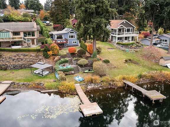 Enchanting Star Lake waterfront home, a rare gem with breathtaking views throughout. Gorgeous landscaping leads you to a serene courtyard with a water feature. At entry, you are drawn to the lake via expansive picture windows that frame stunning lake vistas. The updated kitchen boasts a custom mosaic tile feature, sleek maple cabinetry, an SS fridge, and gas range on eating bar. Rich hardwood floors flow throughout the cozy family room. The Master offers vaulted ceilings and en-suite bath. Downstairs you'll find an additional bedroom, and 3/4 bath with custom tile. Enjoy the views on your expansive deck overlooking terraced yard, charming firepit and private dock. This treasure blends modern elegance with natural beauty.