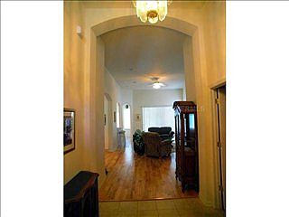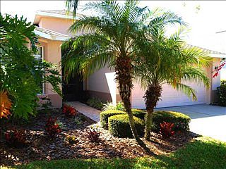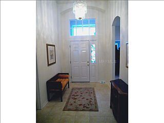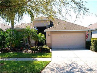 This 3 bedroom 2 bath home located on the 15th hole of River Hills Country is move in ready. The home features hardwood floors in the foyer, living room and dining room. Porcelain tile in all the wet areas and carpet in the bedrooms. The front entry walk and entry features brick pavers. As you walk through the home you will notice the art niches, 42" solid maple cabinets in the kitchen, the travertine tile in the master bath which also has a garden tub and walk in shower. The large covered lanai has brick paver flooring with a 4 person spa. The 2 car garage is climate controlled with epoxy floor coating. Additionally, there is a flex room that could be used as a den, bonus room or storage, it's current use is for golf cart storage. River Hills is a guarded gated community with no CDD. All appliances including washer and dryer are included.
