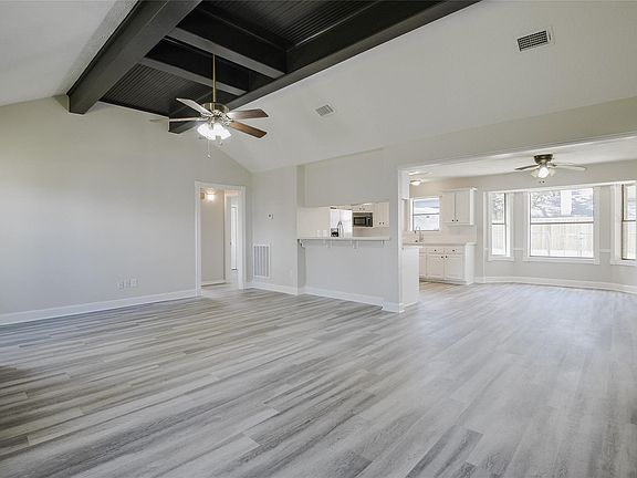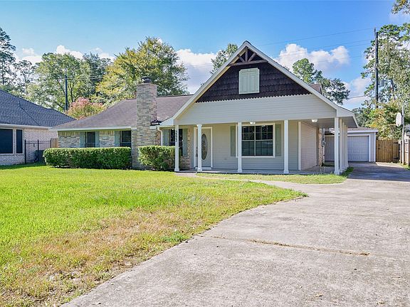 Recent fresh paint inside and out and new flooring in 2024! Charming Victorian home with wrap around porch and detached garage. New Laminate Flooring throughout for easy maintenance, no carpet. Nice open floorplan between kitchen, living, and breakfast room. Refrigerator included! Bedrooms on split floor plan with a large walk in closet in Primary. Primary bath just got a full remodel. Backyard is cross fenced for pets and an additional storage building out back. Enjoy the Lake Shadows amenities. So close to Lake Houston!