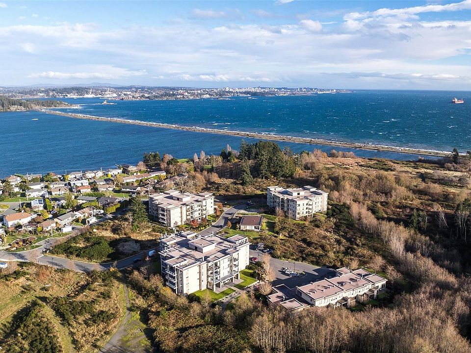NEW LISTING! 180° OCEAN VIEWS FROM THIS BEAUTIFULLY RENOVATED PENTHOUSE Overlooking Esquimalt Lagoon & Olympic Mountains, this stunning 1,500+ sq. ft. 2 bed, 2 bath + den suite offers light, luxury + thoughtful layout. Open-concept design showcases 14' ceilings, flr-to-ceiling Low-E windows, new Valor gas fp ($10K in 2025). Gourmet kitchen features quartz counters, stainless appliances, 5-burner gas cooktop, appliance garage. Elegant finishes: white oak flrs, wool carpet in primary, recessed lighting, dual blinds, Privacy glass-door & wall den, solid wood front door. Primary suite fit for king bed, walk-in closet, spa-inspired terrazzo & quartz bath w dual sinks, soaker tub, separate glass shower. Fantastic floor plan w abundant storage: walk-in pantry, laundry rm w sink, utility rm. Geothermal heating/cooling (with A/C), secure parking, bike storage. Pet & rental friendly, well-run strata. Walk to the beach, trails, parks, nearby shops & transit. WOW