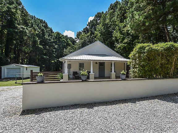 Incredible opportunity to have the best of both worlds, over an acre of land without neighbors and close to downtown Raleigh. This delightful bungalow has been a great live-work space for the current owner. It has been restored to bring it to the current beauty that you see now. Enter into the great room with vaulted ceilings and an open floor plan. The kitchen is equipped with a commercial sink, custom walnut cabinets, concrete countertops, stainless appliances, built in washer and dryer and Restoration Hardware light fixtures. You will quickly notice the custom Hunter Douglas wood shutters throughout. Two bedrooms on the side with vaulted ceilings offer great flexibility and share a bathroom. Extra closet space in both bedrooms for storage. Ample parking with freshly tiled porch. There is underground power to the home and also to the 12x24 utility shed. Spacious deck that opens to a large private backyard with a Texas style fence. Unique property in a rapidly growing South Raleigh location.
