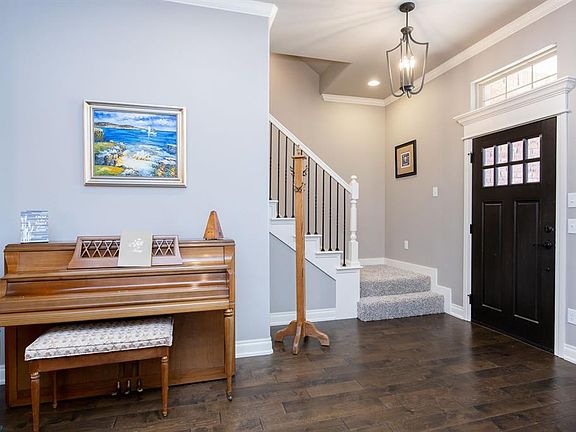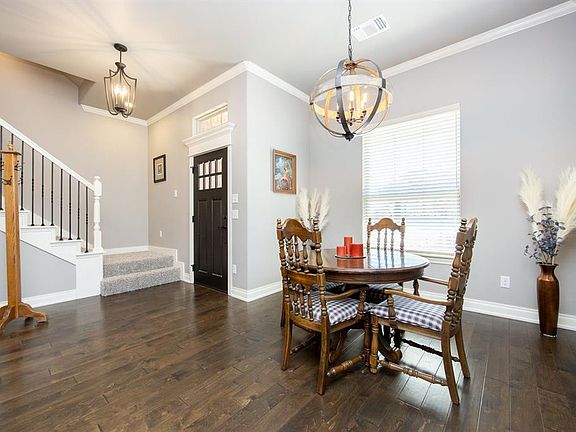 This home has classic craftsmanship with modern beauty. The engineered wood floors, wooden beams and GIANT kitchen island make this home feel warm and inviting. There are 3 bedrooms and a study downstairs and bonus living, 4th bedroom and 3rd bath upstairs. The back yard faces a wooded greenspace buffer area affording a wonderful view and lots of peaceful, relaxing privacy. This well cared for home has been gently lived in and is ready for a new owner. It's served by the popular Centennial Elementary School. There are many upgraded amenities in this home including a large covered patio with fireplace, professionally done decorative concrete landscape edging, large walk-in shower and jetted tub in the primary bath, oversized primary closet with built-in drawers, Rinnai tankless water heater, 5 burner gas stove, double ovens and microwave, leather finished granite counter top surrounding gas stove top, full living space upstairs with a full bath and bedroom just to name a few! This home is located in the beautiful East Edmond neighborhood of Hampden Hollow and has easy, quick access to I-35 making a quick drive to downtown OKC a breeze.