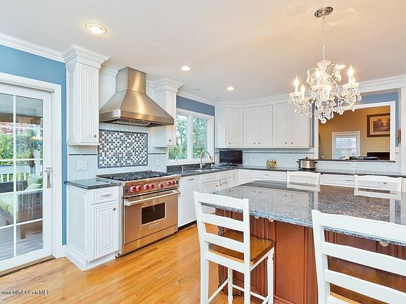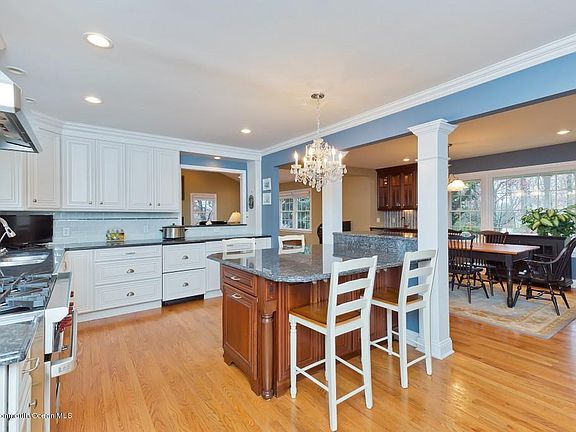 A one-of-a kind sprawling, custom built home features 3 lovely bedrms and 2.5 luxurious baths with over 2300 sq ft. Situated on lush 1 acre of beautifully landscaped property where privacy abounds. Open floor plan w/ stunning, gourmet luxurious upscale kitchen, custom designed cabinetry, built-ins, Wolf 6 range/oven, granite counters. MS bedrm w/ full bath w/ sliders to 3 tier Trek deck. Dining area superior kitchen opens up to a stunning Family Room w/stone f/p, cathedral ceilings; 2 bedrms, 1 full bath on 2nd fl. Fin. basement: pool table, tv rm, workshop rm. Spectacular landscaped property with in-ground pool w/ new liner, hot tub, gazebo, koi pond, firepit. Cantina: built-in beautiful bar, cathedral ceiling. Commuter's delight & superior school system. Priced below appraised value!